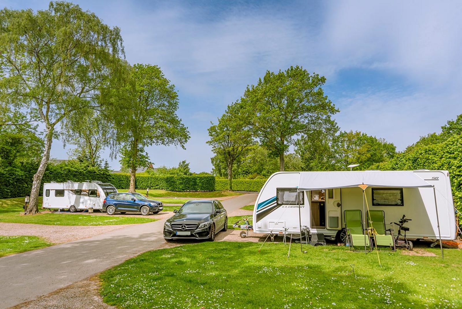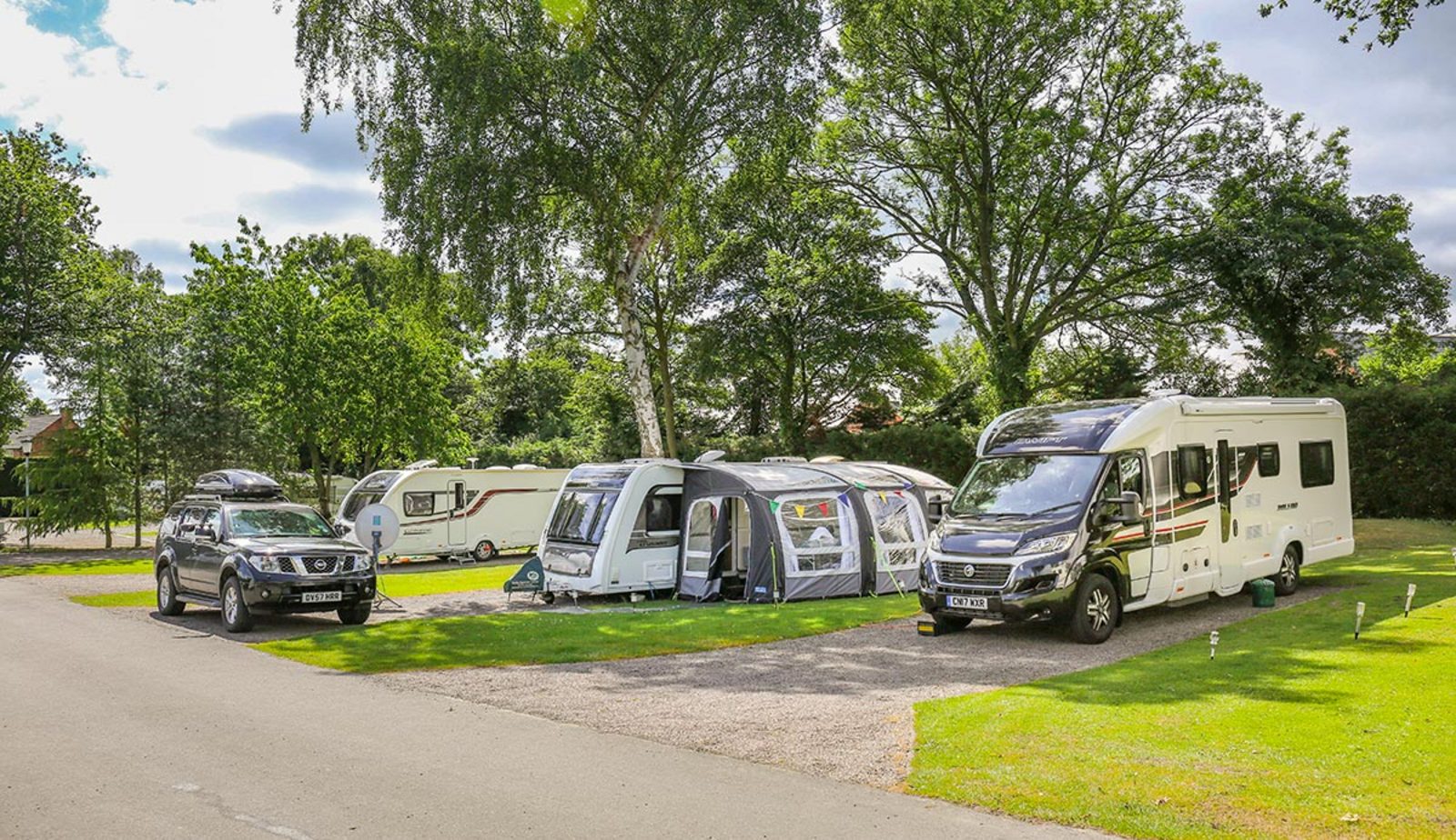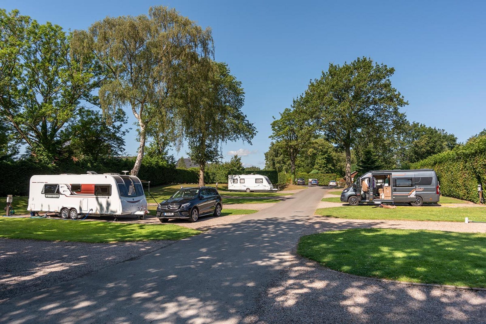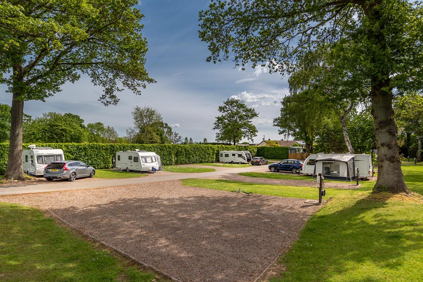 Pearl Lake’s hardstanding touring pitches are spacious, level, and well-equipped for caravans, motorhomes, and campervans. Each pitch includes a 16-amp electric hook-up, drinking water, grey waste drainage, an amplified digital TV connection, and a night light on the service bollard – making it easy to settle in and unwind.